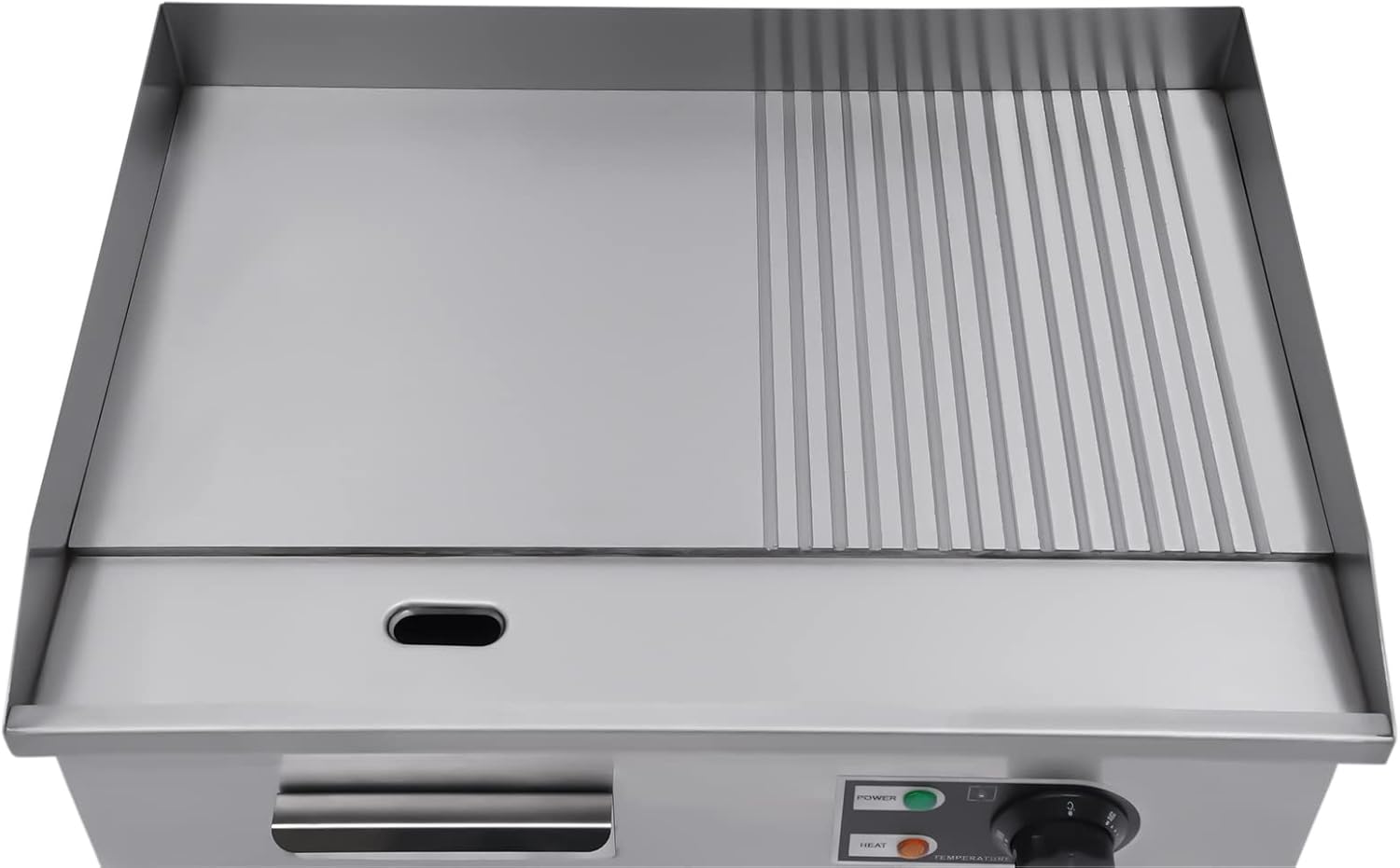 DescriptionThis multifunctional electric countertop griddle with a 22*13.7 inches cooking area can meet both home and commercial needs. With 1600 watts of power and adjustable temperatures from 50-300°C brings you an upgraded and precise cooking experience.DetailsSplash Guards: Prevents food and oil from splattering during cooking, thus reducing cleaning efforts.Non-slip Feet: Fixed machine, reduce machine and ground wear.Oil Leakage and Crumb Hole: The oil leakage and crumb hole allow you to easily dispose of oil and food residue.Oil Collection Box: The drawer-type oil collection box can well collect the residual oil and food residue, and it is easy to take out for cleaning.Multiple Cooling Holes: Multiple cooling holes on the side can help the machine dissipate heat better and extend its service life.ApplicationThis countertop electric griddle can be used to cook a variety of foods, such as pan-fried steak, hand pancakes, fried tofu, and stir-fried noodles. The high power and large area of this electric countertop griddle make it useful not only for home but also for commercial use.SpecificationModel: 821Material: 410Stainless SteelColor: SilverProcess: Bending, Welding, and PolishingPlug: US StandardPower: 1600WVoltage: 110VFrequency: 50-60HZTemperature Range: 50~300℃/122℉-572℉Gross Weight: 19kg/41.88lbsNet Weight: 15kg/33lbsPackage Size: 62*50.5*31.5cm/24.4*19.88*12.4inProduct Size: 55*43*20cm/22*16.9*7.8inWorktop Size: 55*35cm/22*13.7inNotesPlease allow the slight color difference caused by the shooting light and 1-3cm error due to manual measurement. Please make sure you do not mind before you order.