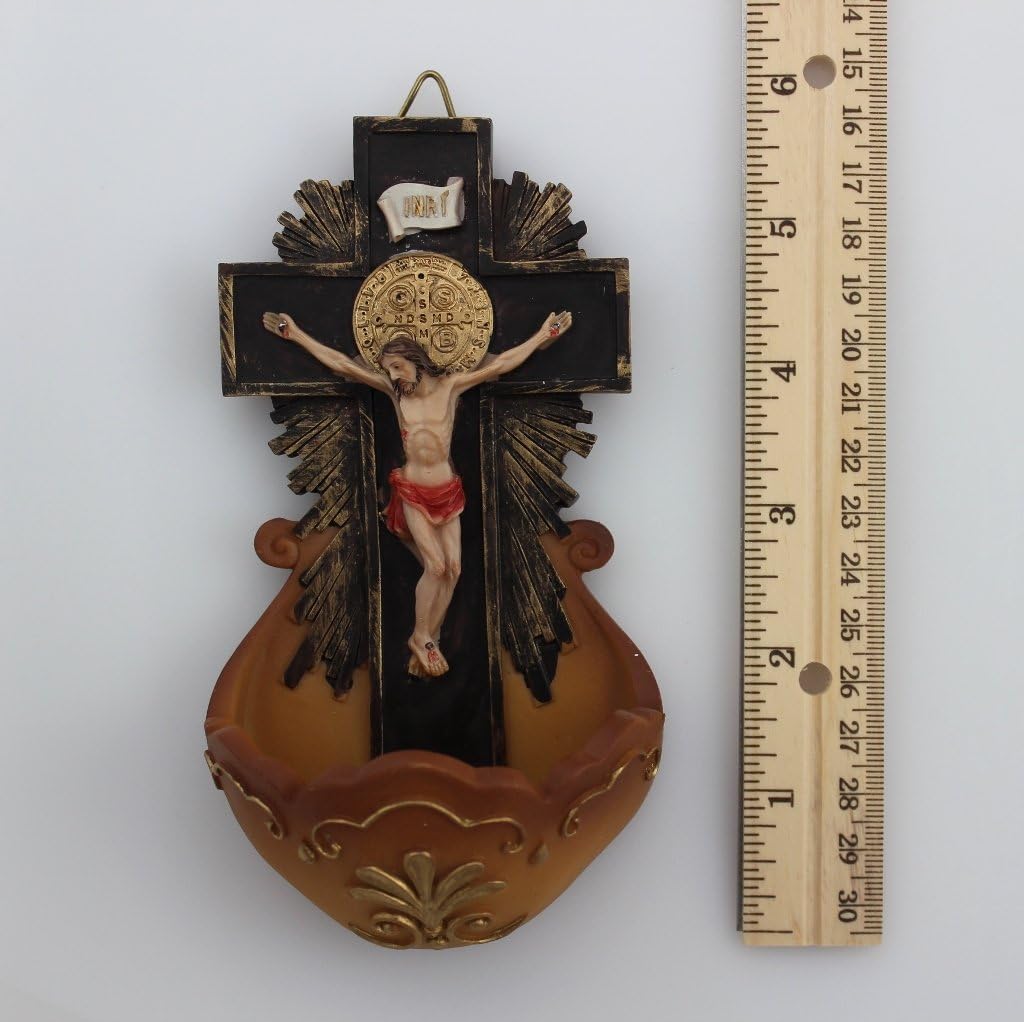 The St Benedict Crucifix Holy Water Font is a beautiful and meaningful addition to any home or church. The font is made of high-quality resin and features a stunning St Benedict crucifix design with a basin for holding holy water. The font is 6 inches in size and can be easily mounted on a wall. St Benedict is known as the patron saint of monks, Europe, and students, and his crucifix symbolizes his powerful intercession against evil. The holy water contained in the font serves as a reminder of baptismal promises and can be used for blessings and protection against spiritual forces of darkness. This font is a great gift for anyone who wishes to incorporate more spirituality into their daily life or who has a devotion to St Benedict. Holy water is not included.