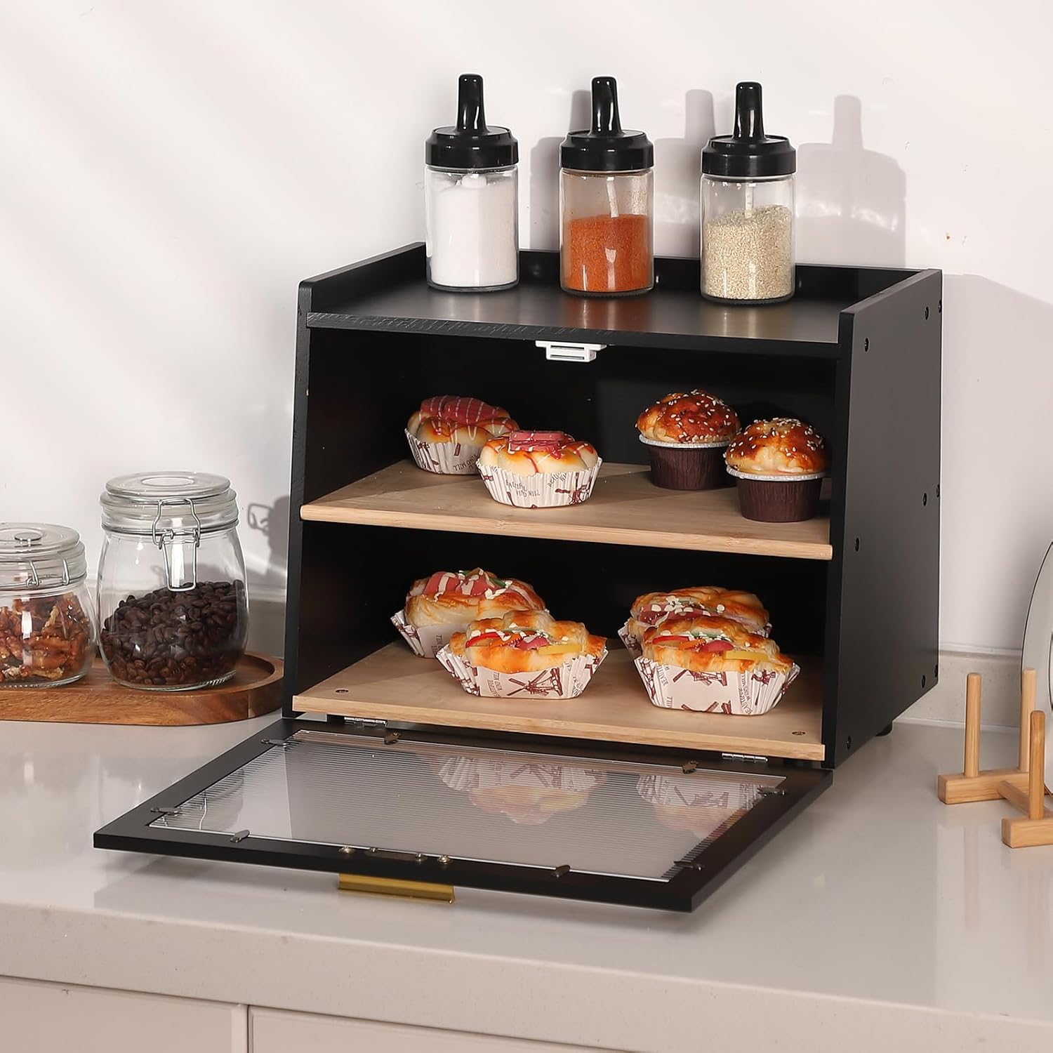 Feature:The bamboo bread storage box retains humidity to prevent quick drying, effectively prolonging freshness and minimizing stalenessThis double-layer bread box offers organized, partitioned storage for your kitchen countertopSturdy 1.1-inch bamboo feet provide a strong load-bearing capacity for this large bread storage containerThe smooth, burr-free metal handle enhances elegance and allows for easy access to your bread binThe hinged doors on this farmhouse bread box adds safe and convenient access to all your baked goodsSpecification:Material: BambooSize: 15.35 x 9.85 x 12.71 inchesPacking List:1 x Bread Box1 x Accessory Pack1 x Instruction ManualNote:Please follow the installation instructions step by step. Before starting, make sure you have all the parts you need.Do not place heavy objects on top of the bread box to prevent undue pressure and damage.Place the bread box in a location that avoids direct sunlight to prevent the bamboo from cracking or discoloring. Use a damp cloth to gently wipe the surface of the bread box.