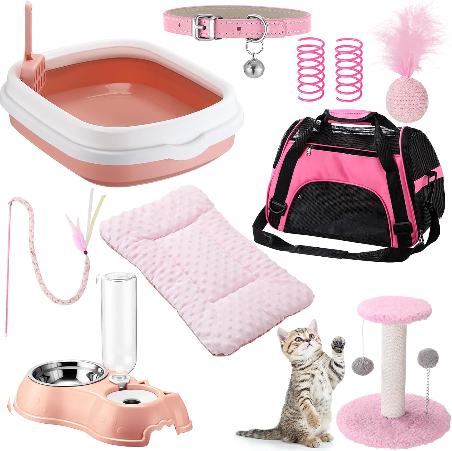 Features: This beautiful blue-themed cat starter kit for indoor cats includes a beanie cat mat and wood cat climber, adding a touch of style to your home decor. Enjoy easy cleaning with our easy-to-clean plastic cat litter box and stainless steel feeding bowl. Ideal for maintaining a tidy kitten space. Specifications: Material: Cat litter box: plastic Cat mat: beanie Cat feeding bowl: stainless steel, plastic Cat climbing frame: wood, beanie Cat collar: leather Cat teaser: feather Color: blue Size: Pet carrier bag: about 16.93 x 12.2 x 7.87 inches/ 43 x 31 x 20 cm Mat: about 16.93 x 11.81 inches/ 43 x 30 cm Cat climber: about 11.81 x 12.6 inches/ 30 x 32 cm Pet collar: about 11.81 inches/ 30 cm Automatic drinking water bowl: about 8.66 x 8.07 x 2.56 inches/ 22 x 20.5 x 6.5 cm Cat litter box: about 15.75 x 13.19 x 4.72 inches/ 40 x 33.5 x 12 cm, delivering scoops Cat teaser: about 46.46 inches/ 118 cm Package includes: 1 x Pet carrier bag 1 x Mat 1 x Cat climber 1 x Pet collar 1 x Automatic drinking water bowl 1 x Cat litter box with scoops 1 x Cat teaser 1 x Toy ball 2 x Spring Notes: Manual measurement, please allow slight errors on size. The color may exist a slight difference due to different screen displays.