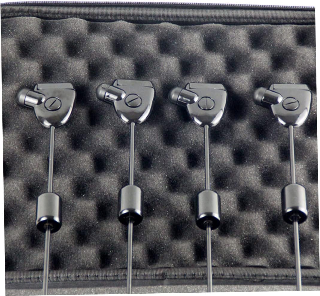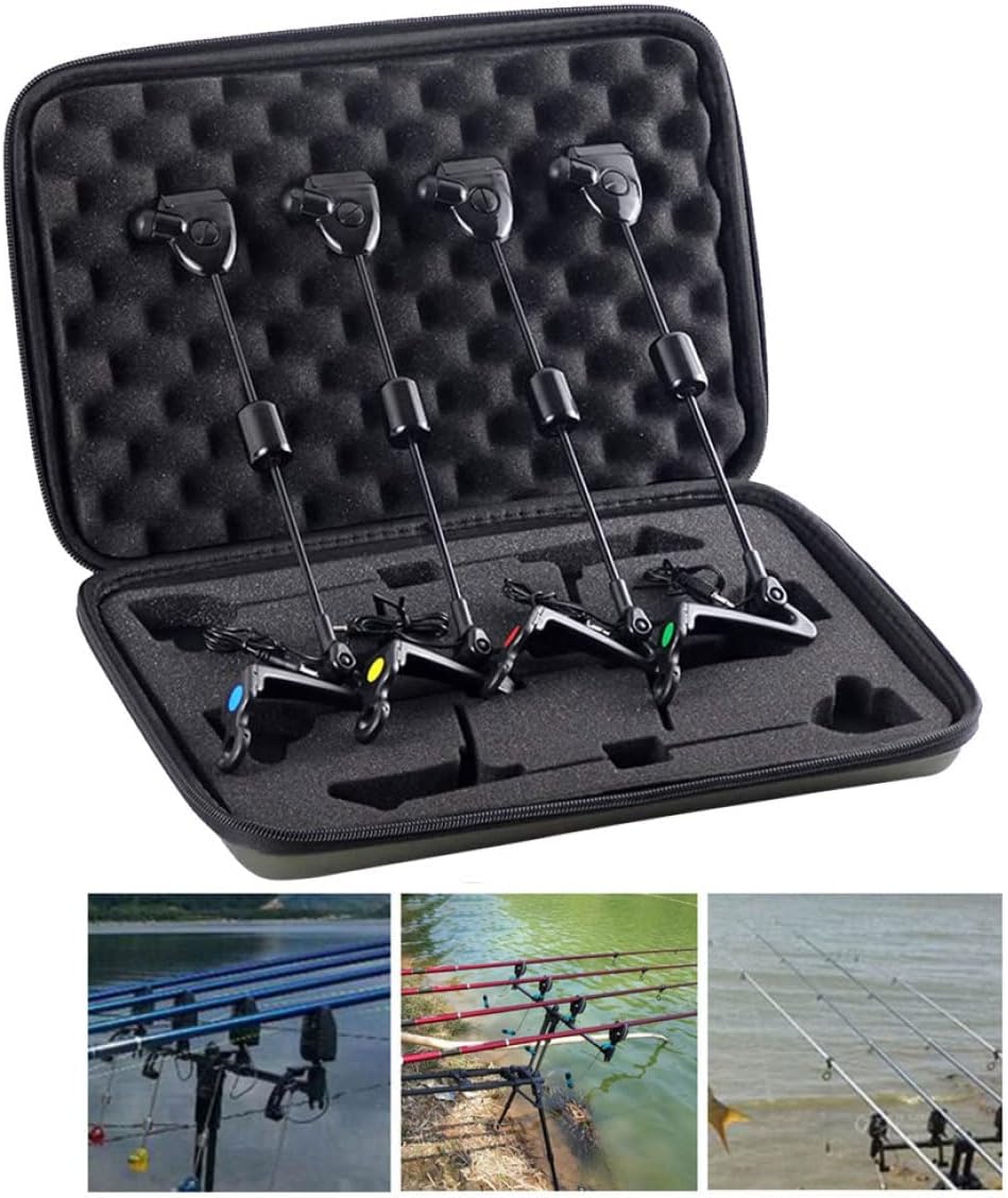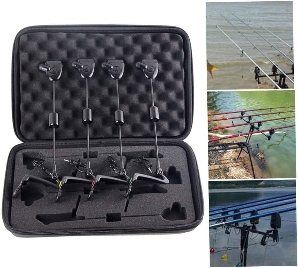 Description This fishing bite alarms indicator is combined with alarm, and its main function is to tighten the fishline on the roller of alarm. Standard 2.5mm plug fit all type bite alarms. Designed equally effective whether you are fishing with slack lines "under your rod top" or with tight lines at distances. Features Fishing -Color: Black. -Material: Metal, Plastic. -Size: 33x20x4.5 cm/12.99x7.87x1.77 inch. When the fish comes to your hook, it will give you It will illuminate when working. Suitable for day and night time fishing. Note: Manual measurement, please allow slight errors on size. The colors may exist slight difference due to different screens. Package Including 4 * Fishing