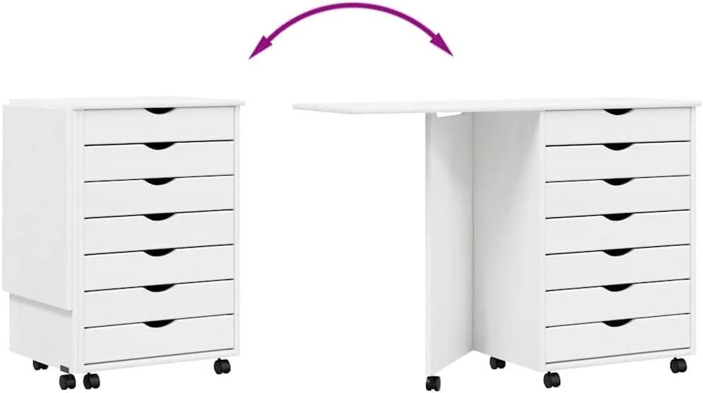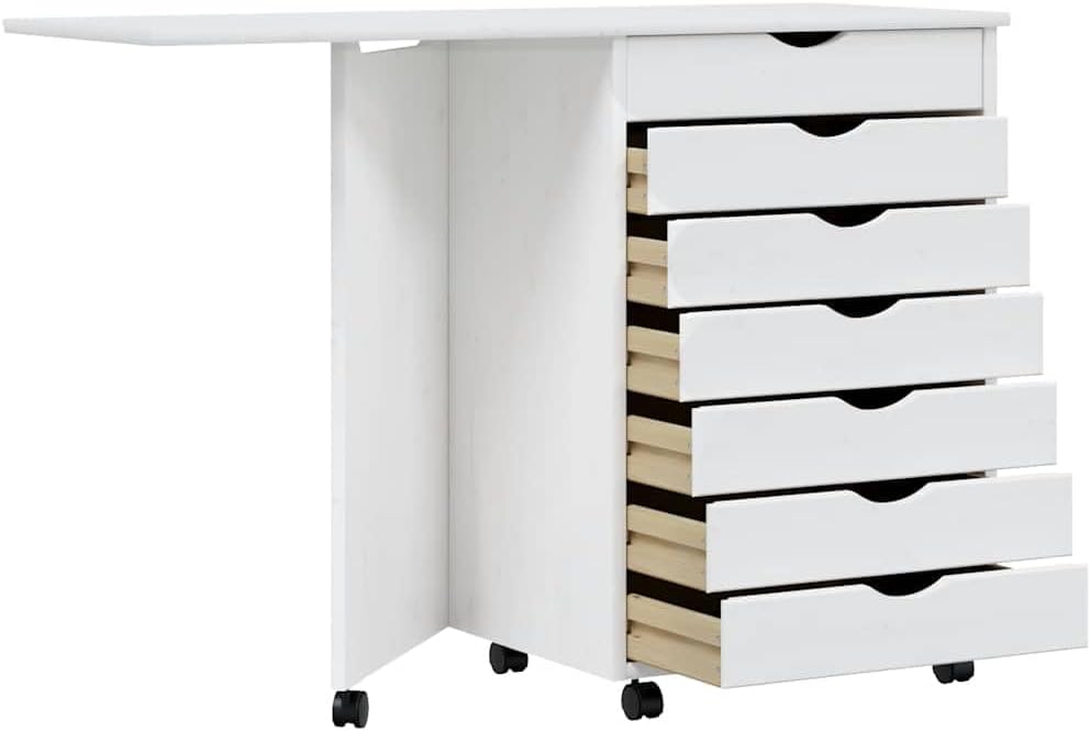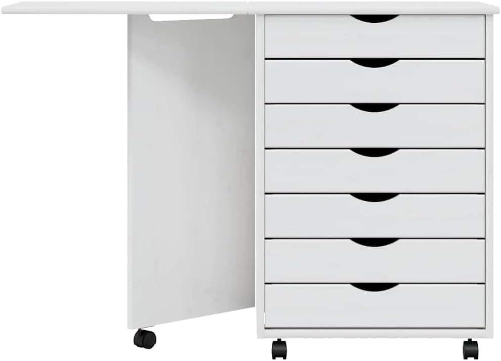 This White Solid Pine Rolling Cabinet with Desk is a clever and stylish addition for any home or office, blending functionality with a contemporary design. With its sleek lines and smooth feel, it's both a practical storage option and a good-looking piece of furniture that fits in with various styles while giving easy access to your work essentials.Ample Storage: The cabinet boasts seven roomy drawers, perfect for sorting documents, office supplies, craft items, or personal belongings. Its generous storage space helps keep your workspace neat and tidy, ensuring everything is easy to reach when you need it.Modern Design: With its minimalist vibe, matte white finish, and simple lines, this rolling cabinet fits right in with today's decor trends. It upgrades any space, whether living rooms or offices, adding a bit of elegance without being overpowering.Foldable Feature: Made for flexibility, this cabinet can easily fold down for compact storage or transport, making it ideal for small spaces or on-the-go needs. Its foldable design means you can move or tuck it away without any hassle.Color: WhiteShape: RectangularMaterial: Solid Pine woodFinish: MatteIndoor/Outdoor: Indoor OnlyCover Included: NoRoom: Living RoomMaximum Number of People: 1Dimensions: 15.4 x 41.5 x 29.3 in. (W x L x H)Min-Max Dimensions: 0Surface Height: 0.8 in.Wheel Diameter: 1.6 in.Weight: 37.21 lbsLadder: NoDelivery Contains: Rolling cabinet with deskAssembly Required: YesRecommended Number of People for Assembly: 2