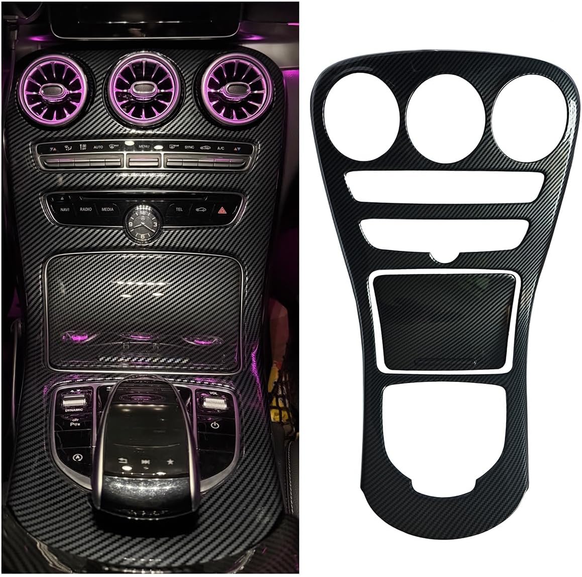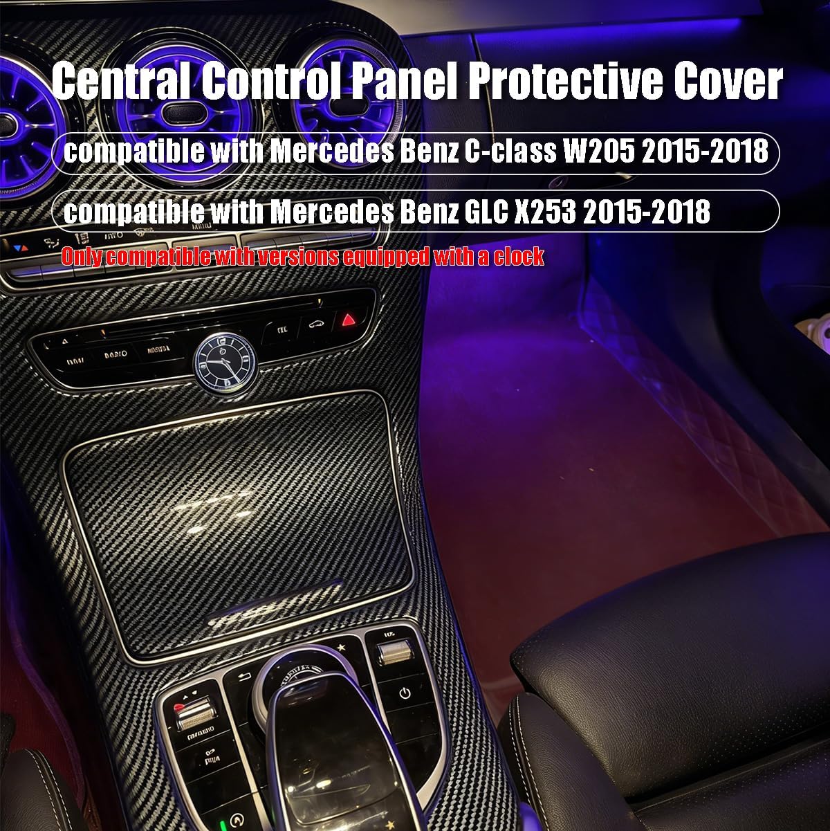 Upgraded Full-wrap Center Console Gear Shift Panel Cover Compatible with Mercedes Benz C Class W205 2015-2018, Carbon Fiber Pattern Interior Accessories for GLC X253 2015-2018(with Clock)