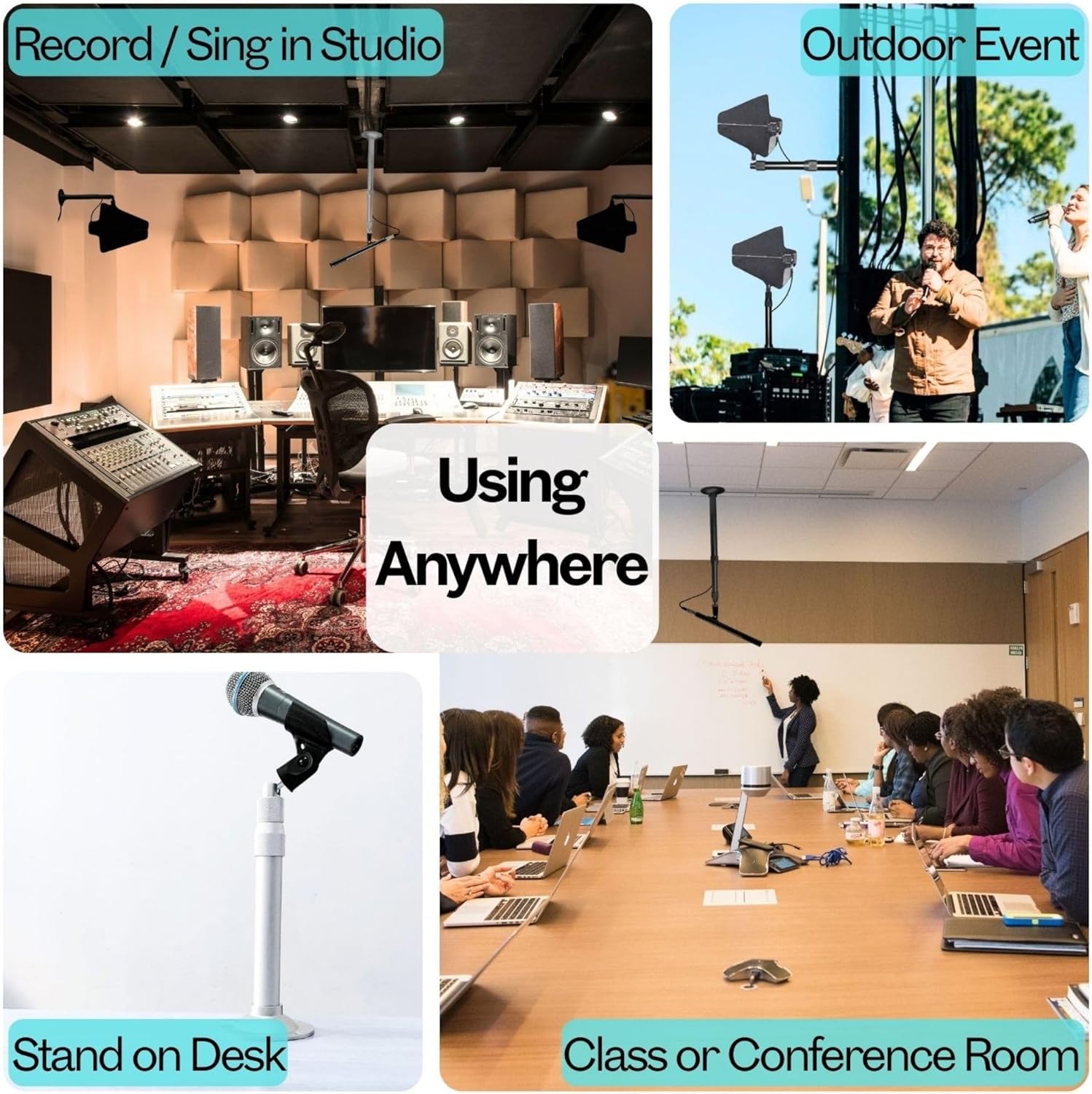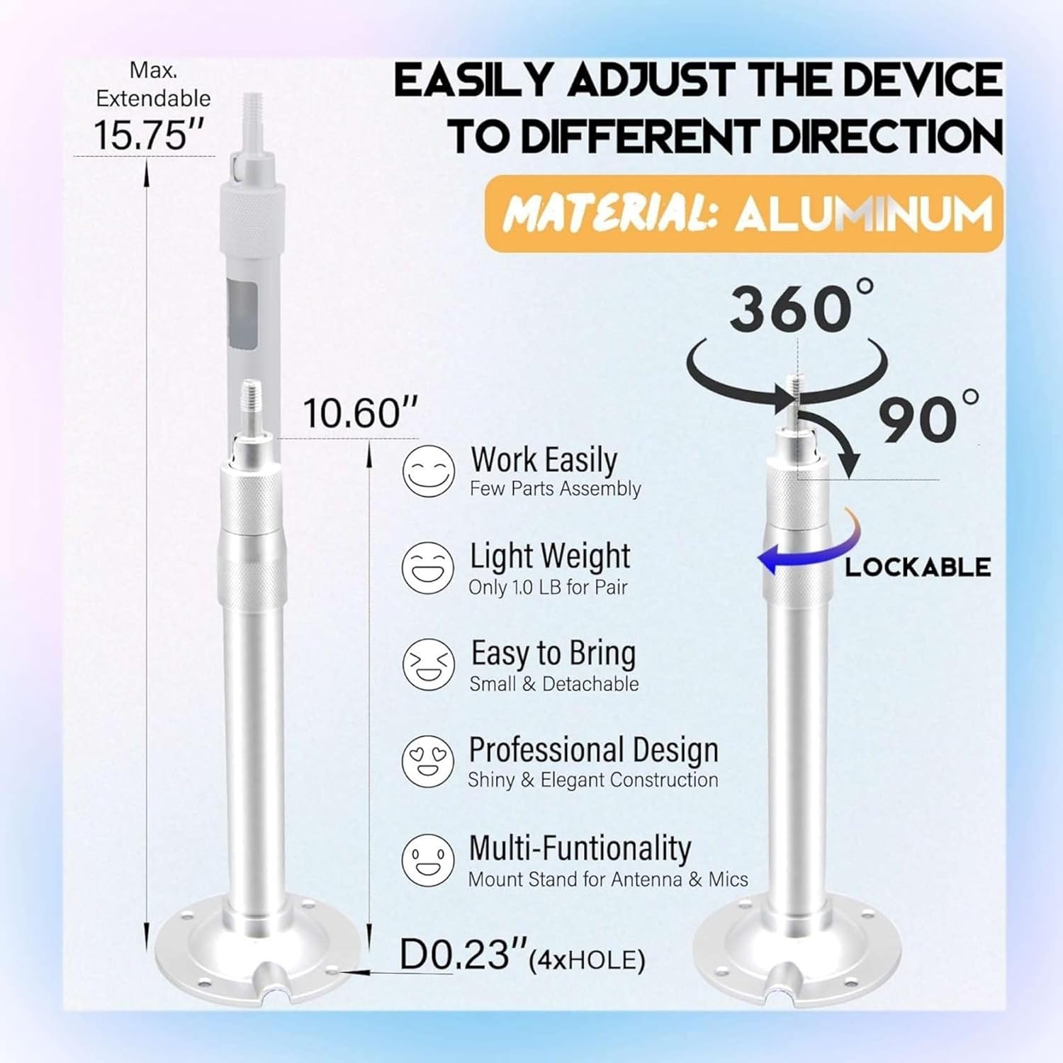 Professional Mounting Infrastructure for Audio and RF Systems The Adjustable Mounting Stand Bracket is engineered to solve the most common installation challenge in pro audio: incompatible thread standards. Unlike generic camera mounts that only offer 1/4-inch screws, this unit is built specifically for the professional audio and wireless spectrum industry. Solved: The 3/8" vs 5/8" Compatibility Issue Out of the box, the bracket features a native 3/8-inch male thread, the standard for European audio gear (compatible with brands like AKG, Neumann, and Senheiser mounting clips). For US-based installations, we include a precision-machined 3/8-inch (female) to 5/8-inch (male) adapter. This creates a rock-solid connection point for standard American microphone clips, shock mounts, and wireless antenna yokes (compatible with Shure UA874, RF Venue Diversity Fin, and similar directional paddles). Designed for Integrators Cable Management: The hollow aluminum shaft allows you to run thin XLR, Ethernet, or coaxial cables inside the pole, eliminating unsightly hanging wires. Adjustable Drop: The telescopic pole extends from 20cm to 40cm (7.9" - 15.7"). This specific length is critical for dropping antennas below false ceilings or lighting grids to ensure a clear "line of sight" to the stage transmitters. Rigid Stability: Unlike flexible goosenecks that sag over time, this rigid aluminum arm stays exactly where you set it. The 90-degree tilt head allows for precise angling of shotgun microphones for choir pickup or aiming antennas toward the performance area. Technical Specifications Material: Rust-resistant Aluminum Alloy Finish: Matte White (blends with standard ceiling tiles) Load Capacity: Supports up to 3kg (6.6lbs) - sufficient for heavy active antennas. Base: 4-hole flange for secure anchoring.
