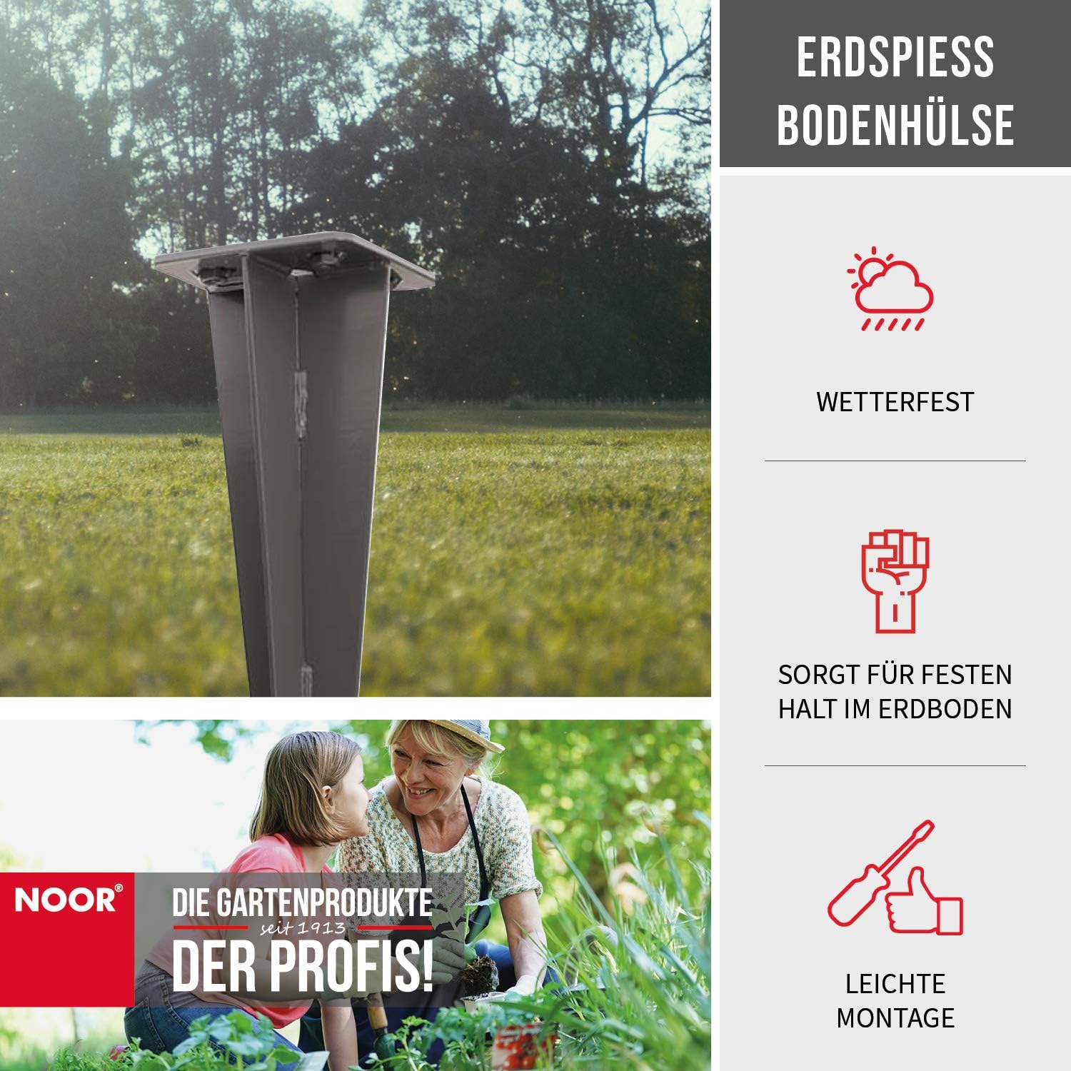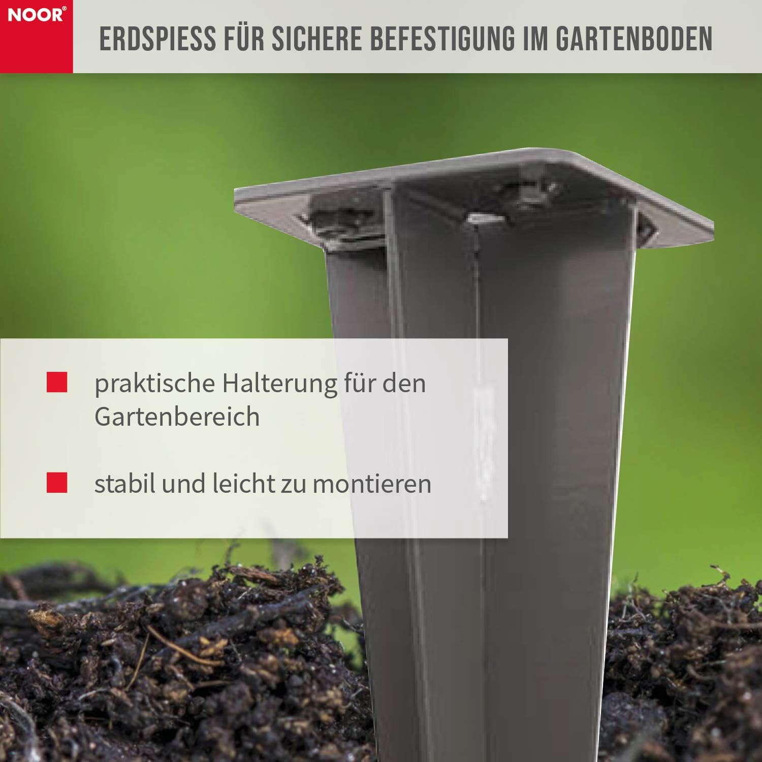 The Noor side awning is a practical wind and privacy protection. It keeps out unpleasant draughts and cold wind and protects you against the deep sun in spring and autumn and, of course, also from prying eyes from the outside. Thanks to the practical construction, you can tension the Noor® side awning at any time. For assembly, the included two brackets are simply mounted on the house wall and the retaining post at the desired distance (up to max. 3.5 m) attached to the base. With the ergonomic handle holder, the awning is easily hung in the retaining posts. A spring shaft in the wall cassette keeps the cloth on tension. The Noor side awning is made from weatherproof polyester fabric (280 g/m²). The cloth colour is anthracite. The cloth is made from a 280g/m2 heavy polyester fabric in the colour anthracite. Accessories optional: 1. Base mount for holding posts. You can remove the support post which is normally firmly screwed to the ground easily and without much effort. 2. Stand posts should no wall mounting of the side awning be possible, you can screw the stand post on the floor and the supplied retaining clips of the side awning on the retaining pin. The side awning 1 m cannot be mounted on the stand post. 3. Wall bracket. If you want to mount the side awning between two terrace posts, you can do without the supplied mounting post and use the wall bracket. So you do not need to drill holes in the floor. 4. Ground sleeve/ground spike. For mounting the retaining post. The ground spike should be concreted so that it stands properly.