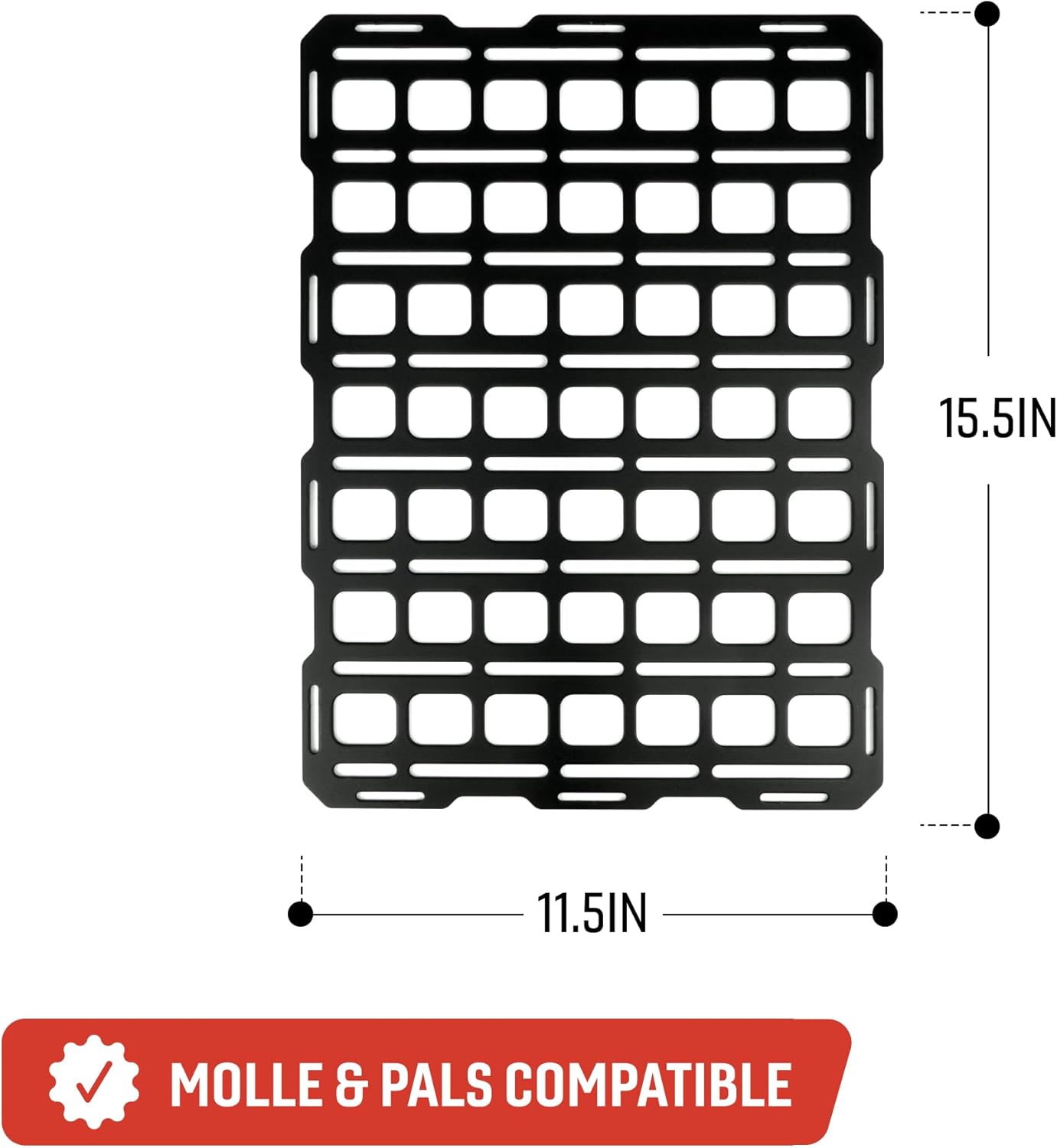 The BuiltRight Industries Tech Plate is a universal MOLLE mounting panel measuring 11.5 inches by 15.5 inches, designed to enhance storage and organization across various settings. Precision-manufactured from 1/8-inch Grade 50 steel, this panel offers exceptional strength and durability, making it suitable for mounting in truck beds, gun safes, garage walls, or vehicle cargo areas. The textured black powder-coated finish provides resistance against corrosion and wear, ensuring longevity even in demanding environments. Its modular design incorporates MOLLE and slotted mounting locations, offering versatile attachment points for tools, accessories, and gear. Additionally, slots for 1-inch webbing around the perimeter enhance its adaptability for various applications. Please note that mounting hardware is not included with the Tech Plate; however, BuiltRight Industries offers a 42-piece Mounting Hardware Kit and MOLLE Nuts to expand mounting options and simplify installation. The Tech Plate is backed by BuiltRight Industries' Lifetime Warranty, ensuring quality and customer satisfaction.